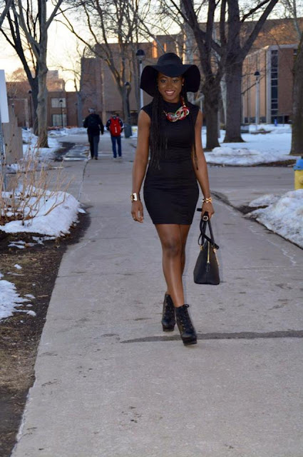 Now back to business #smileyFace. A really lovely ankara jewellery designer eTURNER COUTURE contacted and sent me one of her very gorgeous necklaces. I believe all her necklaces are handmade. The quality of the material is really good. Great finishing. They are all very unique, stylish and can take any outfit from boring to chic in one second. Just imagine my outfit without that necklace #BORING. To style the necklace, I went with an all black approach. Black turtle neck bodycon dress from Hot Miami Styles, Black wide brim cap from Ardene, Black lace up Booties from Shoe Dazzle and to make the more stylish, I went with a grey coat instead of black.